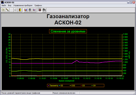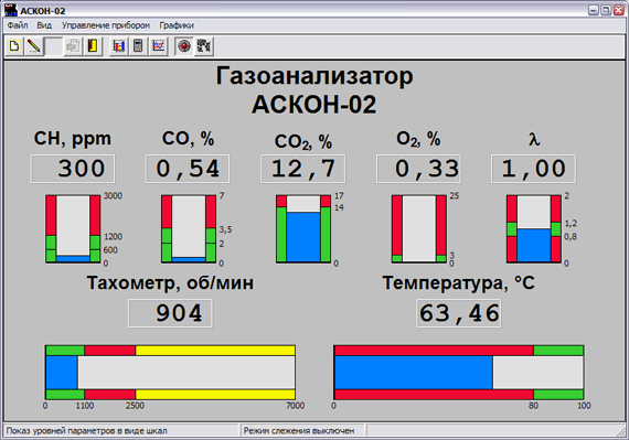 просмотр параметров измеряемых компонентов в отработанных газах в виде диаграмм (рис. 1), где синий столбик – это величина измеряемого компонента, зеленая зона указывает на нахождение измеряемого компонента пределах нормируемый величины, красная зона – превышение измеряемого компонента нормируемой величины,- на минимальных и повышенных оборотах.