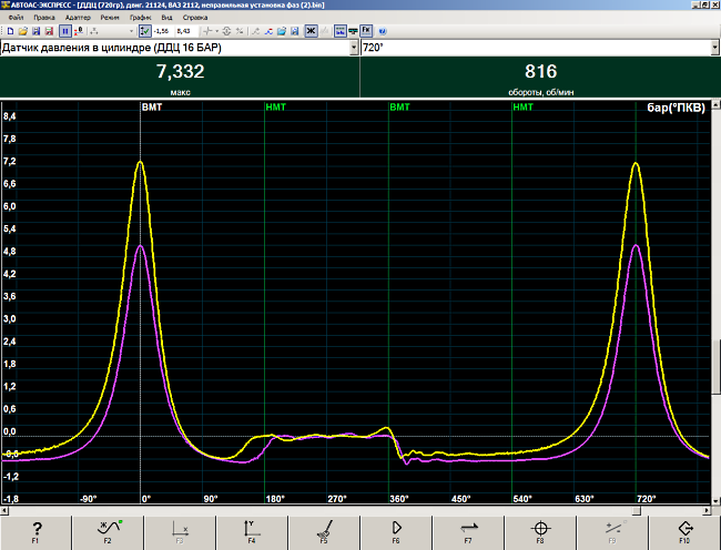 Точность взаимной установки коленчатого и распределительных валов производится на основе контроля местоположения характерных точек и участков графика давления в цилиндре относительно горизонтальной оси угла поворота коленчатого вала двигателя, а так же путем сравнения регистрируемого графика давления с графиком, ранее сохраненным при работе с исправным ДВС аналогичного типа.