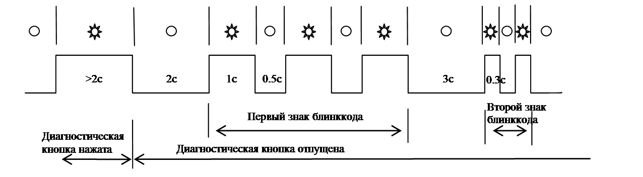 Диагностика двигателя проводится нажатием и удерживанием диагностической кнопки более 2с. После отпускания кнопки диагностическая лампа промигает блинккод неисправности двигателя в виде нескольких длинных вспышек (первый знак блинккода) и нескольких коротких вспышек (второй знак блинккода).