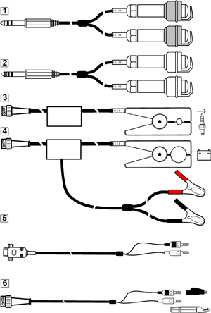 Модуль датчика тока 4 предназначен для измерения силы тока до 500 А в цепях автомобиля и состоит из датчика, кабеля и преобразователя сигнала, установленного на кабеле. Датчик тока имеет стальной магнитопровод, в зазоре которого установлен электронный преобразователь Холла. Датчик имеет маркировку для правильного расположения его на токонесущем проводе. Преобразователь сигнала представляет собой электронное устройство, заключенное в пласмассовый корпус. В торце корпуса преобразователя расположен резистор для подстройки нуля датчика тока. Подстройка нуля датчика производится тонкой отверткой. Для подстройки необходимо снять датчик с токонесущего провода и замкнуть его сердечник. Питание преобразователя сигнала датчика осуществляется от АКБ автомобиля или другого источника постоянного тока напряжением 12 В. Для подключения к источнику используется кабель с двумя большими зажимами черного и красного цвета Кабель генератора 5 заканчивается двумя штырями красного и черного цвета для подключения к коммутатору форсунок, датчикам системы управления двигателем. Кабель осциллографа 6 заканчивается двумя штырями красного и черного цвета для подключения к клеммам аккумуляторной батареи, первичной цепи, датчикам системы управления двигателем. В комплект к кабелю прилагаются также зажимы типа "крокодил" и прокалыватели.