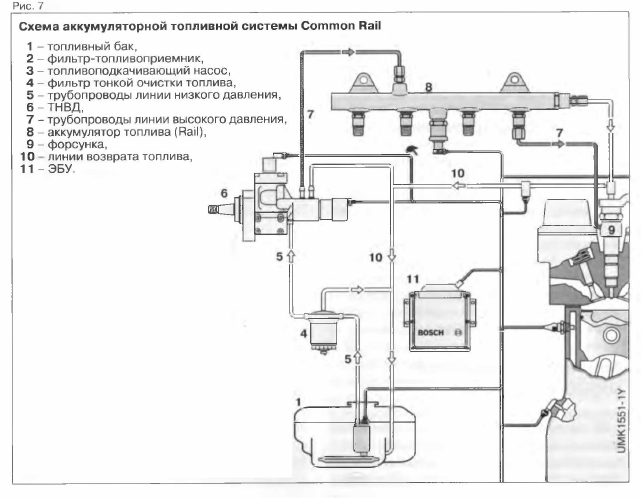 Аккумуляторная топливная система Common Rail включает в себя ступень низкого давления, ступень высокого давления и ЭБУ. Схема топливной системы CR показана на рис. 7.
